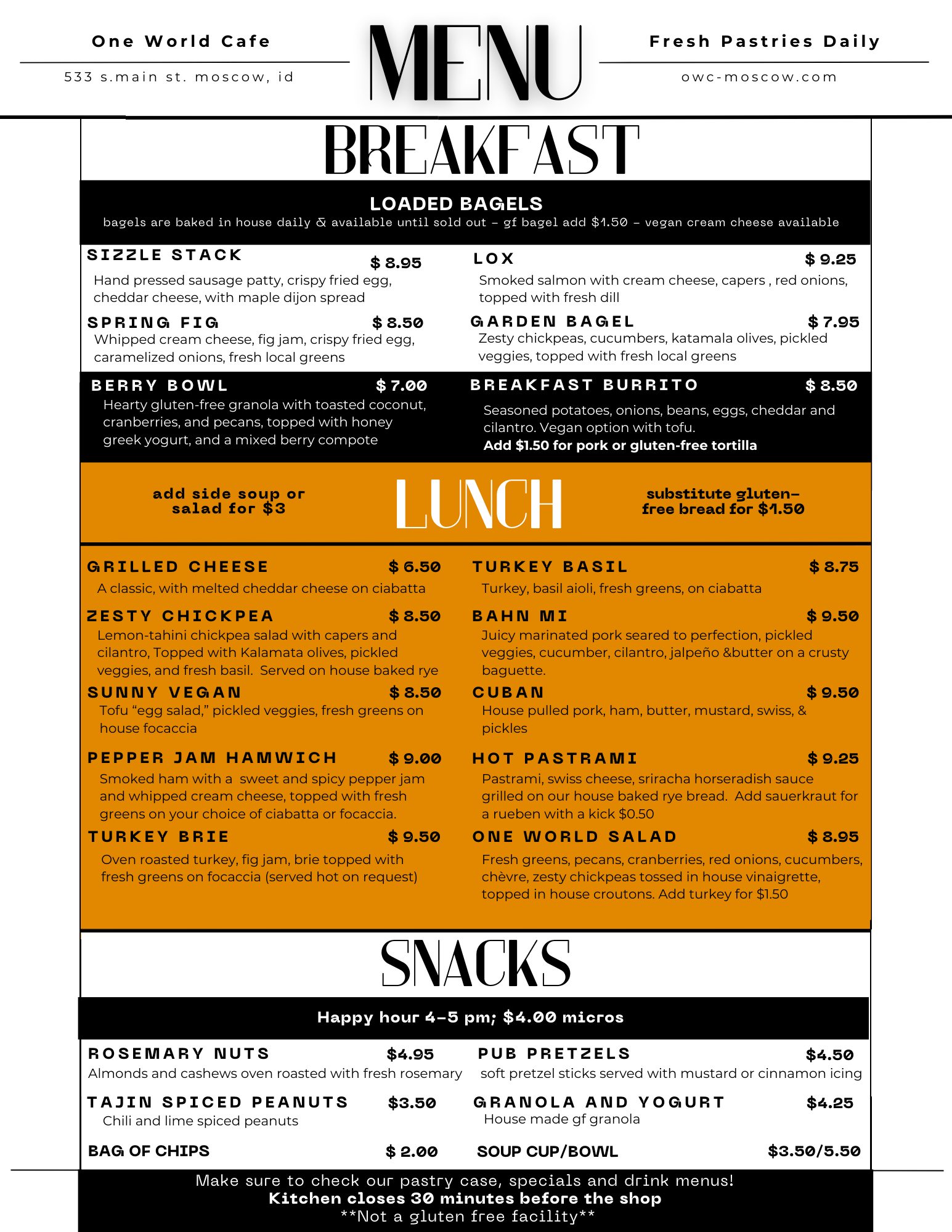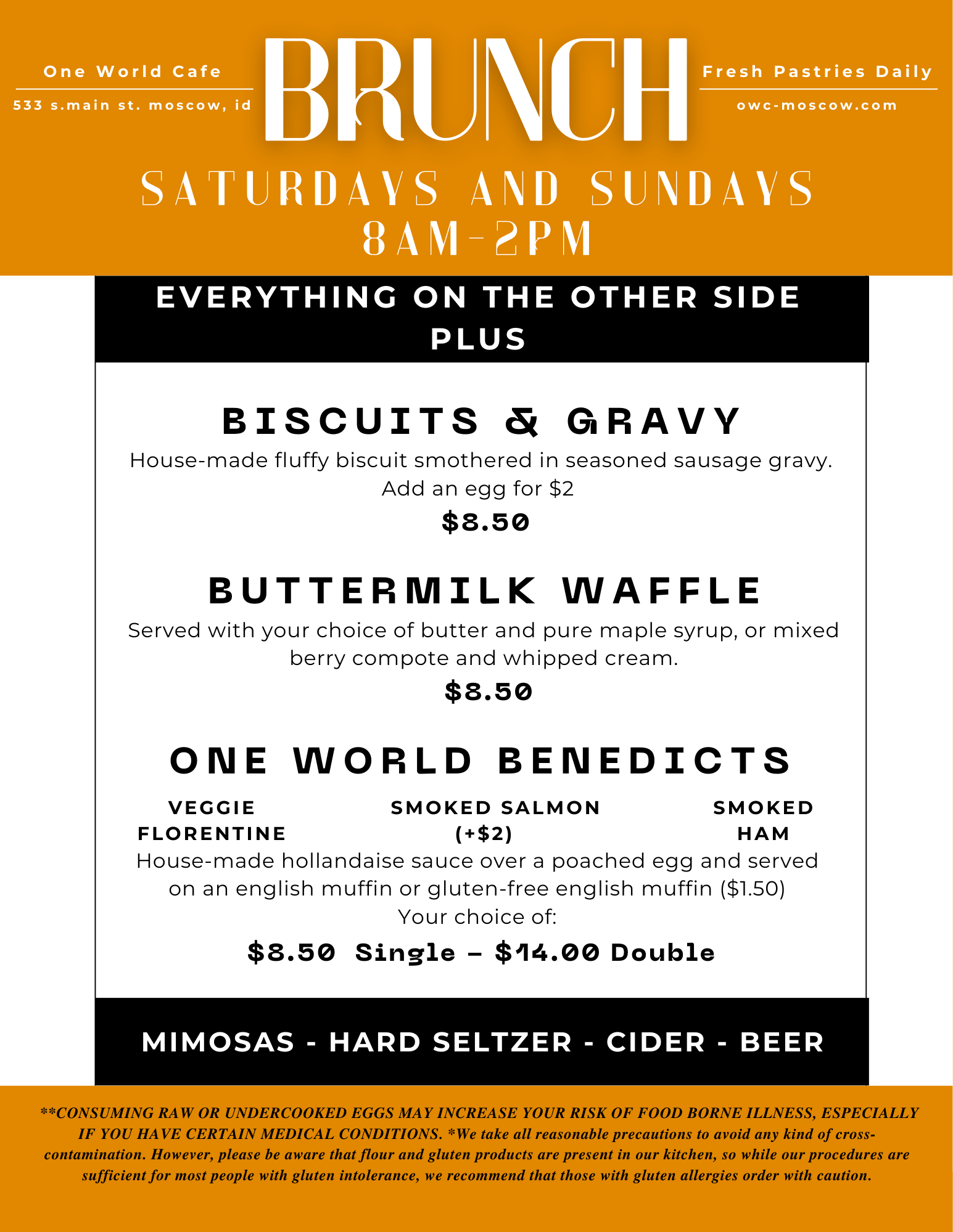 Our Menu. DRINKS FOOD Chocolate Croissant Salmon Lox Bagel Turkey Basil Sandwich Biscuits and Gravy One World Benedict